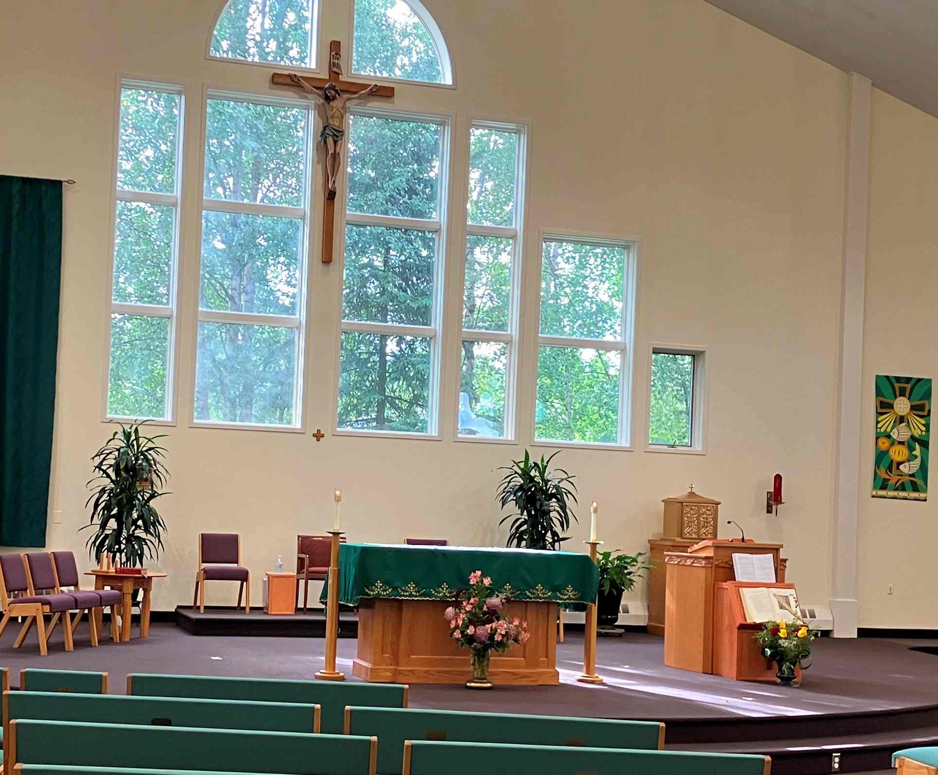 As we landed, our stomachs were growling. Alaska Airlines had only provided a couple cups of coffee, a few stale cookies, some apple juice, and a handful of pretzels. Our Anchorage friend knew better and ordered a pricey salad for lunch. Hunger was replaced with the anxiety of picking up our rental car. Avis had a nice Mazda SUV ready for us. Before heading for the exit, we asked for help with the navigation system. We were challenged by all the buttons and knobs. Thankfully, I had brought a USB cord to attach to the console. Google maps would save the day. We had a few minutes for some fast food before a 5:00 pm vigil Mass at Holy Cross Church (see below) so we followed the GPS directions to a nearby McDonald's. Enjoying a second childhood, we ordered happy meals without the toys. Later on, we felt at home with local parishioners and a retired priest at Mass, a great start for the week.