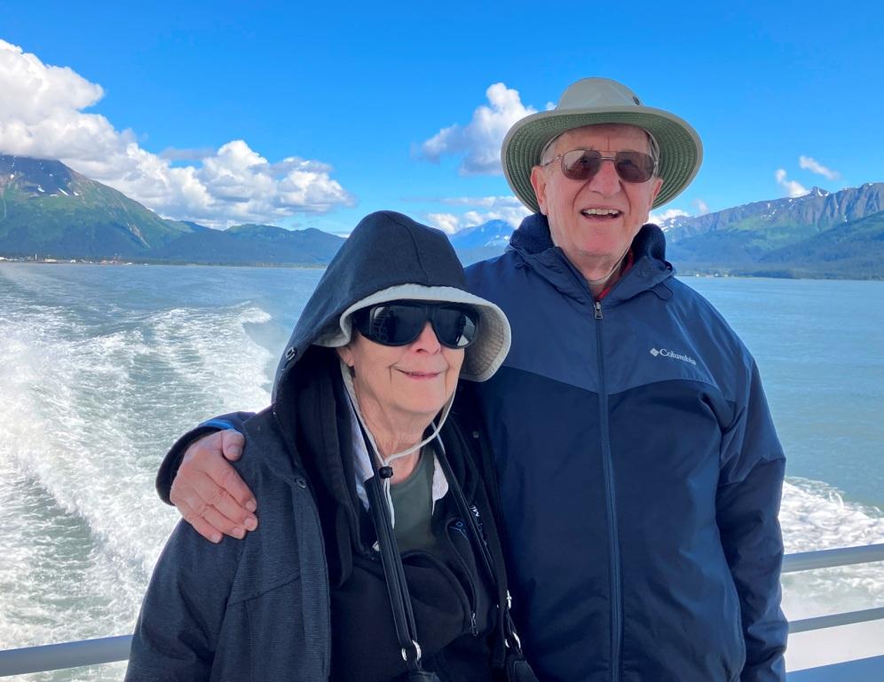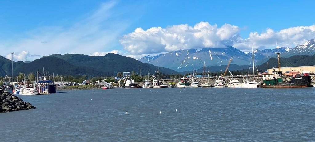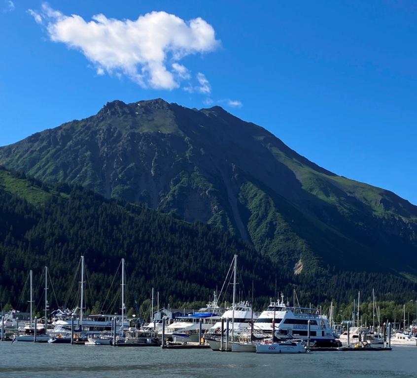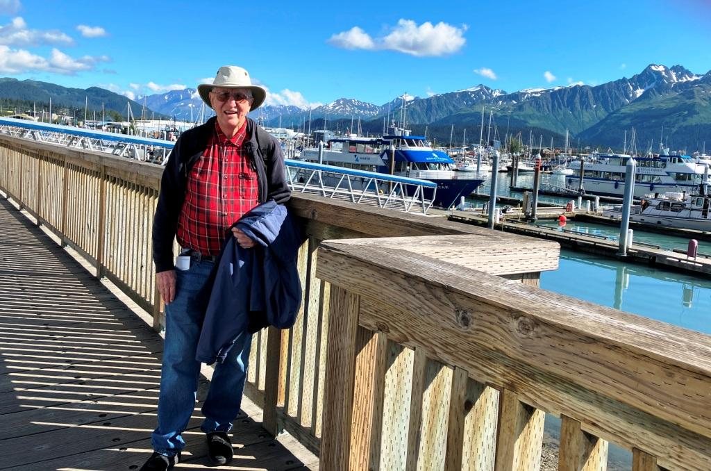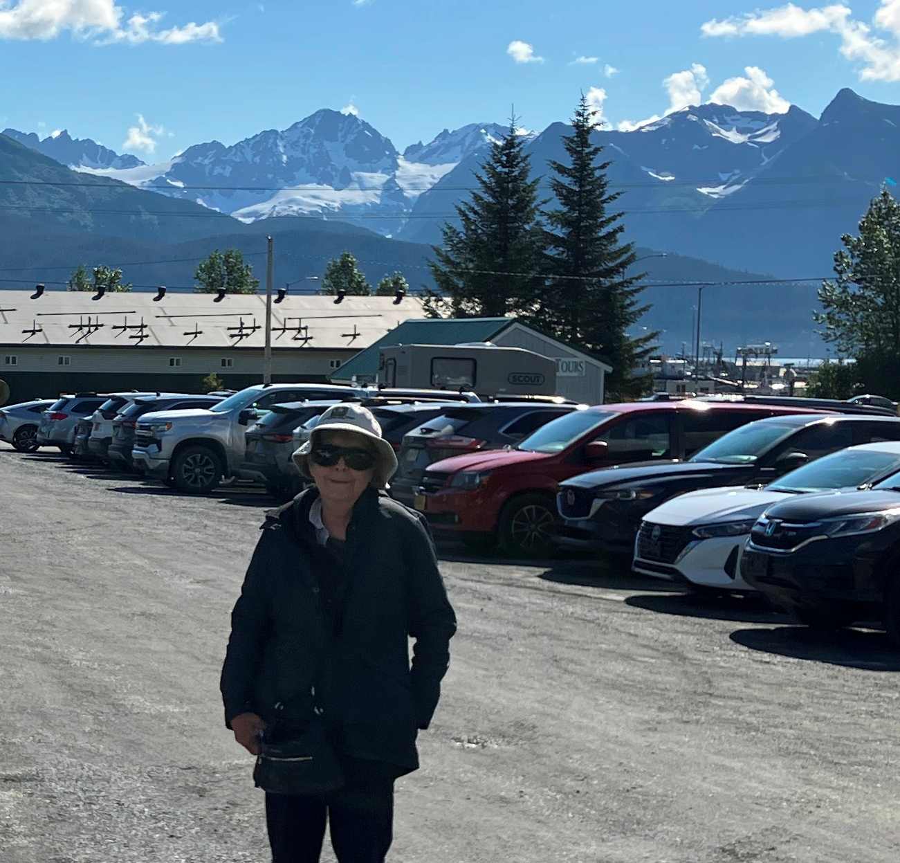 We pulled into Seward by 11:00 and took a shuttle bus from the parking lot to the cruise vessel. Barbara posed in the morning sun with stunning mountains in the background. I posed on the dock as we prepared to board.