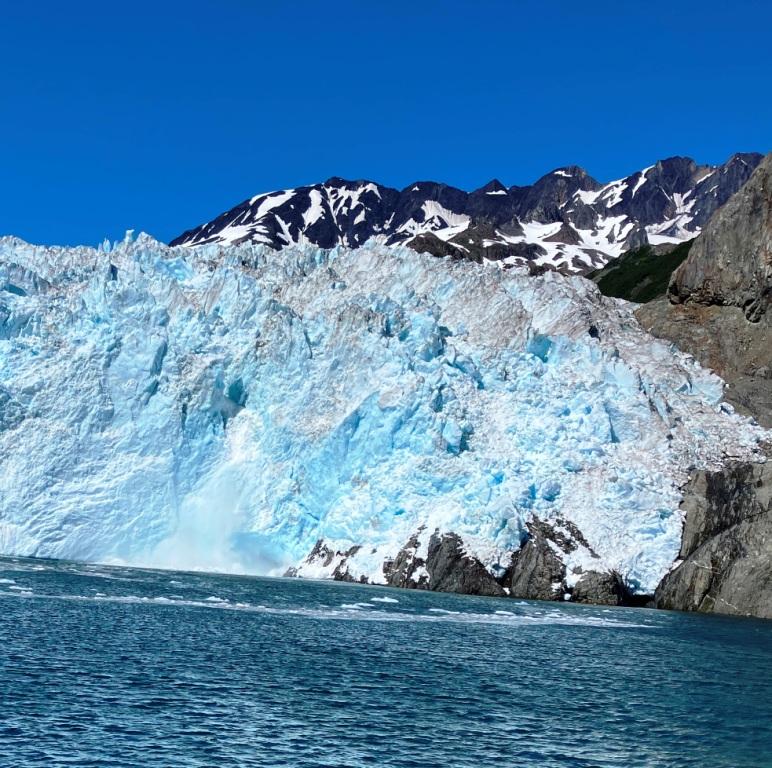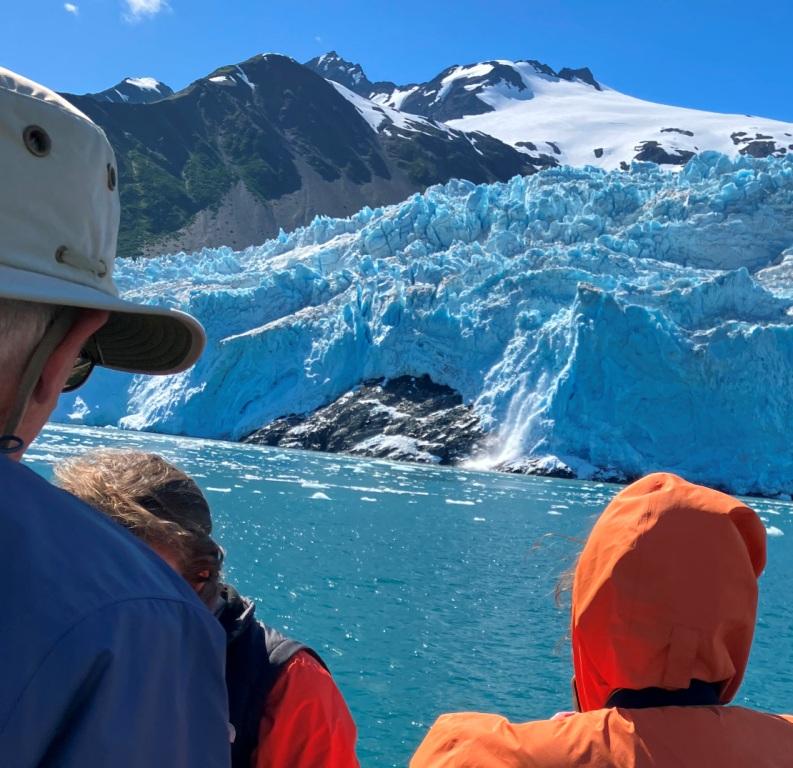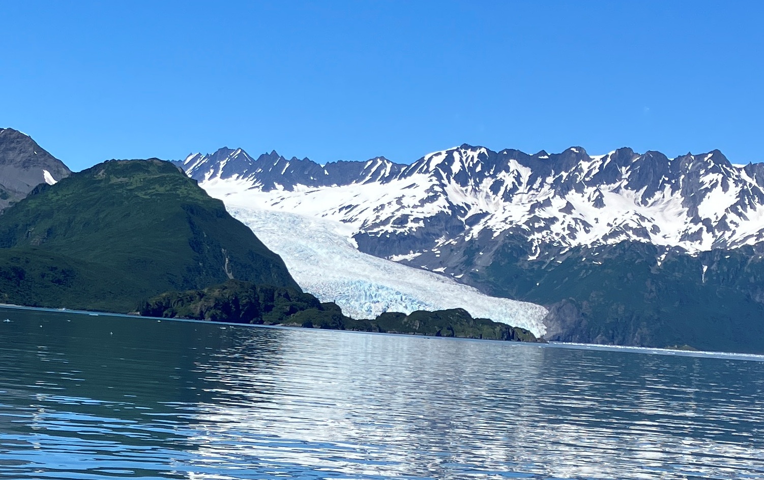 The weather remained clear and the sea was calm. The cruise included spectacular views of rock formations, glaciers, mountain peaks, puffins, and beluga whales. The most amazing sight was the calving of an enormous glacier with the simultaneous shotgun-like blast when various portions of the glacier broke off into the ocean.