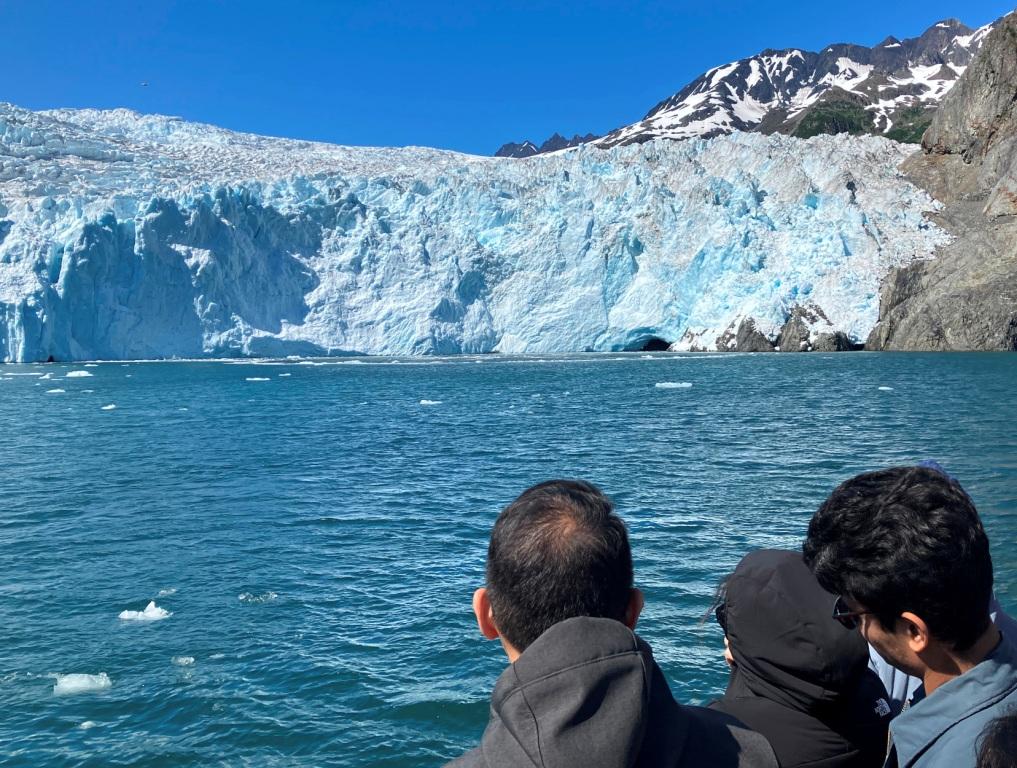 We soon joined a line of other glacier seekers. The line was short, so we figured that we must be early birds. As soon as we were on board, we saw that most seats were taken on the upper and lower cabins. Descending from the upper cabin, we saw a few open seats. I asked an older couple there if the seats were taken. They smiled and welcomed us to take what seemed to be the only seats remaining. Now we were paired with a Hindi couple, a tech guy (Lucent Inc.) and his wife, a doctor of internal medicine. I broke the ice with them with the correct Hindi greeting, Namaste. They were only a few years younger than us and we were friends for the rest of the trip. It seemed that the boat was filled with tourists from all parts of India (including Punjab), and nearby Bangladesh, and Pakistan. I tried out greetings from their countries: Sat Sri Akal, Namaste, Salaam, Salaam Alaikum. They were all friendly, and we took pictures of couples and family groups in exchange for our own couple picture.