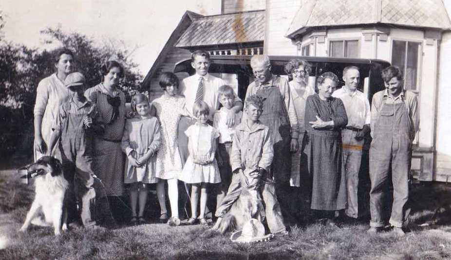 William Albert Redinger Farmhouse: From Left: Pearl Redinger, Cleo Eldon Redinger, Nellie May Tuggle, Rachel Elaine Redinger, Francis Wilma Redinger, Frank Norton Redinger, Helen Marie Scherer, Paul Redinger, Garland True Hammack, William Albert Redinger, Nellie Grace Redinger, Etta Jane (Norton) Redinger, John Leonard Scherer, William Wayne Redinger.