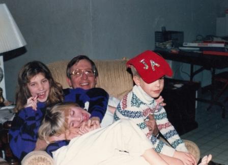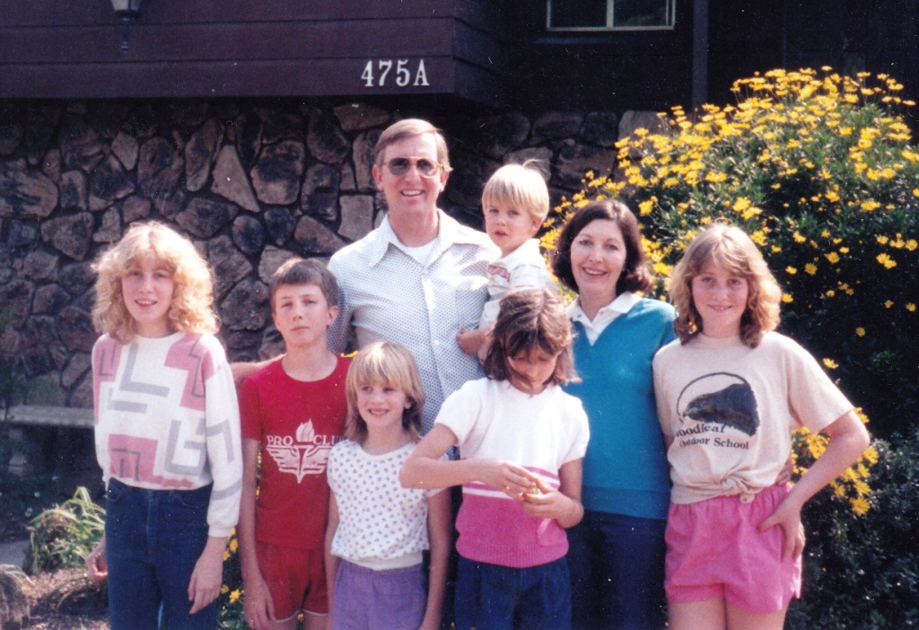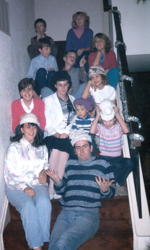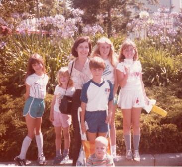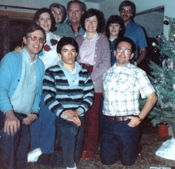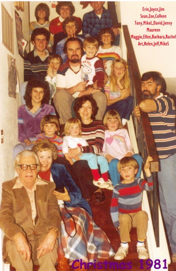 Jennifer's First Communion picture at Los Bravos home in Yuba City, Back row: Barbara with Ellen, Ged, Mary, Art, Helen with Maggie; Front row: Jeff, Jennifer, Rachel; Jim & Barbara at Mike & Zoe's