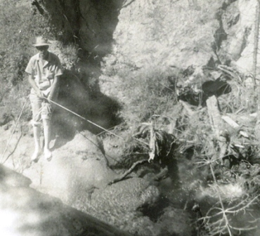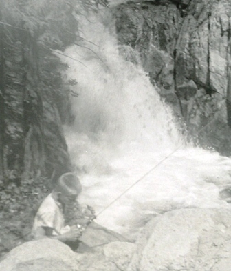 Our Sunday drives now took us to Friant Dam, Pine Flat Dam, Yosemite, Sequoia and King Canyon National Parks, Shaver Lake, Millerton Dam, Bass Lake and other mountain locations. On one trip Dad bought some bamboo poles and taught us to bait fish like he had on the rivers in the Midwest. Getting up well before dawn, he took me alone on a few fishing trips below Bass Lake. He and his friends had a good laugh when I caught one of the first trout of the season doing everything wrong but still snagging a legal size fish. Dad and I try our luck below: