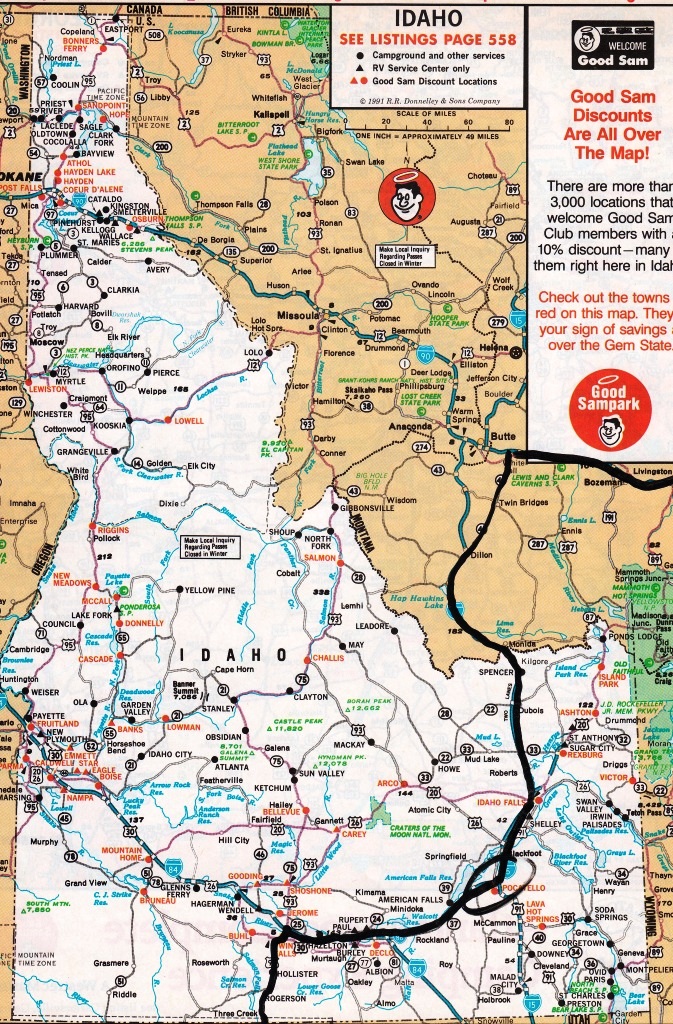 Our big adventures were behind us, so we were delighted that we could go as fast as we wanted on I-94 and I-90 across Montana and down I-15 to Pocatello. We followed the Yellowstone River through dry, flatland before climbing into the Rocky Mountains through Bozeman and Butte before turning south through more forests and rivers until we reached flat, dry stretches of Idaho.