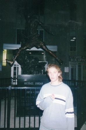 The sun was going down as we pulled up to the United Center. We were disappointed to see the statue behind a fence and a locked gate. I knew Maggie would be frustrated if we couldn't get close enough for a picture. So, I told her to follow me as I explained my latest brainstorm: "We stop, drop, and roll under the the security gate and run for a photo op at the statue. If we get stopped, I'll tell the guard that we're just some country folks from Wheatland that want to snap a picture." As soon as Maggie was positioned for the picture, a guard showed up. I played the country bumpkin part, and the guard told us, "Just get out of here." We ran back to the gate and rolled under it. Mission accomplished.