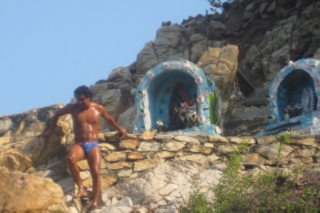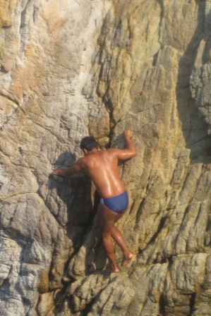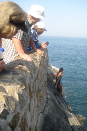 The divers climb the cliff, pray at a shrine to Our Lady, then ascend the rocks to a diving spot