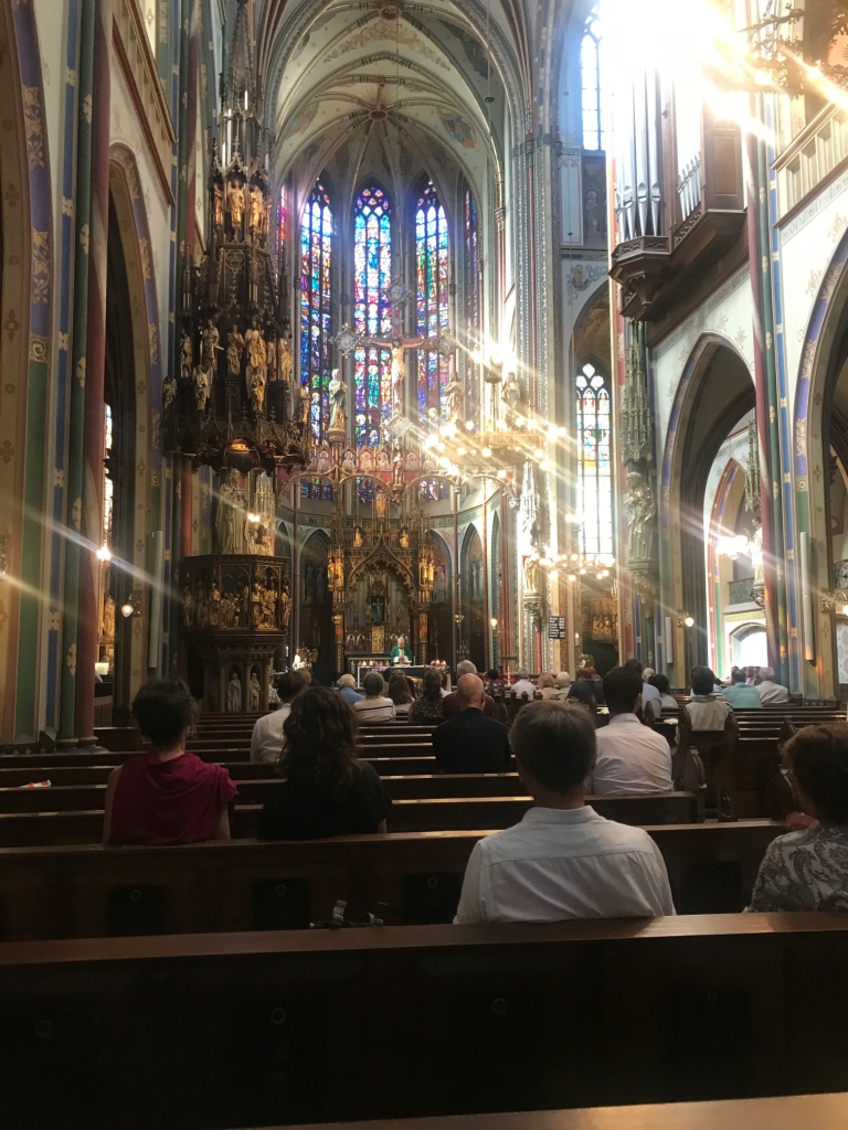 By now we were tired from walking and sweating because of the heat wave in Amsterdam. We decided to try one last, apparently Catholic, church. We ended up at St. Francis Xavier Church (The Krijtberg), run by the Jesuits, certainly Catholic. We caught the end of Mass and took a picture of the spectacular interior: