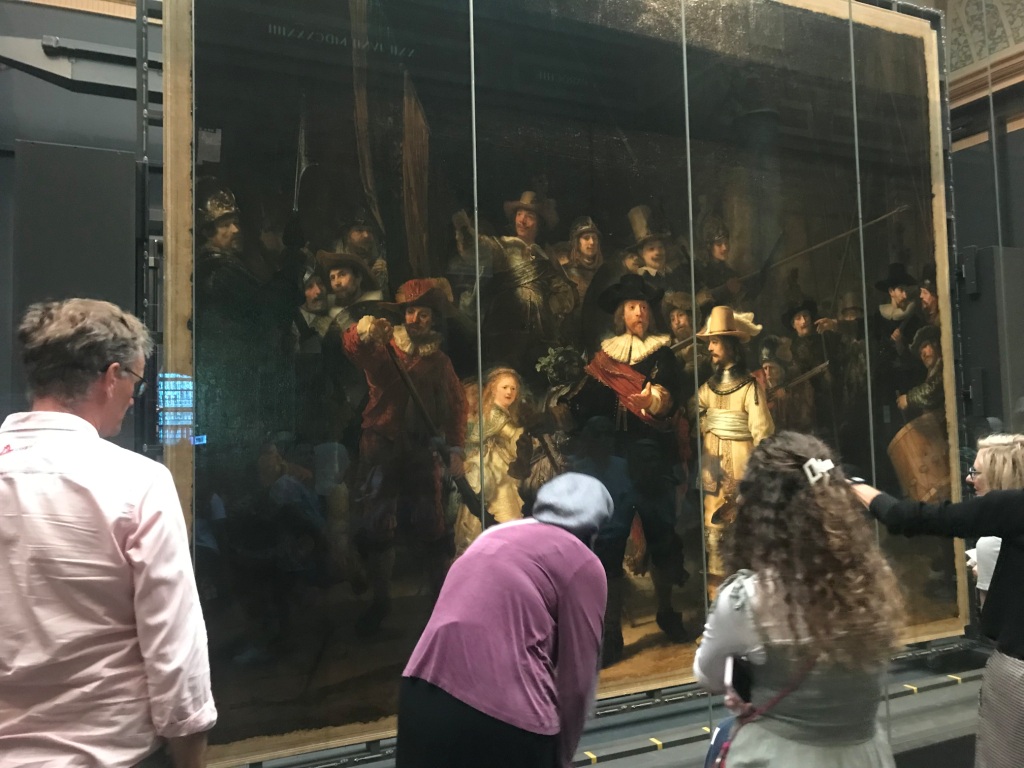 Next, we paid for listening devices to tour the museum and tried to find the Rembrandt paintings. It was impossible to find the paintings as we listened to the narration, so we found a bench to listen to the descriptions then sought out the paintings. It turned out that the museum displays a total of about 20 Rembrandt's interspersed among other Dutch Masters. Some of the paintings were tough to view behind security glass and throngs of tourists: