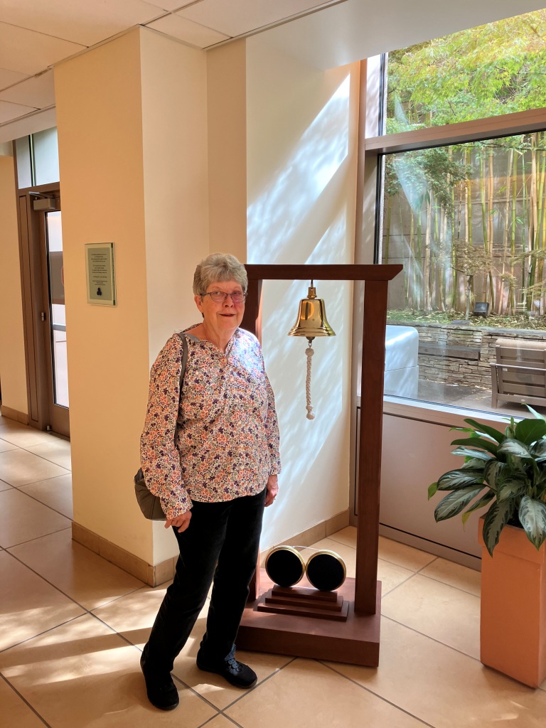 After three weeks, the radiation treatments were over. Barbara posed by the bell where patients celebrate the end of Stanford treatments. Life on Easy Street wasn't as easy as pictures of our trips portray. The radiation caused an intense sunburn around Barbara's eyes at first. Several weeks later the sunburn changed into swelling and a running sore area worse than a black eye of a boxer after a fight. The radiation also caused stabbing pains at times, a watering eye, and an eye infection. Healing is expected by the middle of November. Additional plastic surgery may be needed as well as periodic PET scans to be sure the cancer has not returned. Loss of energy may also occur at any time.