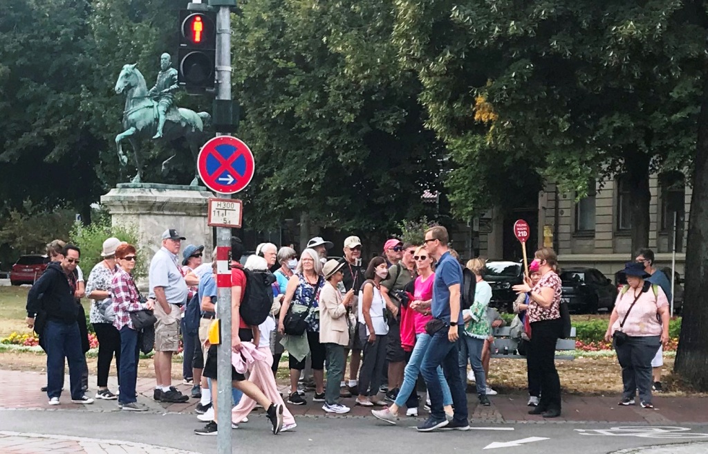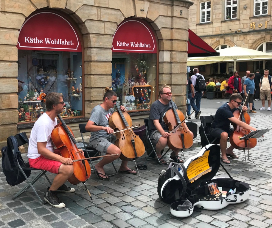 The bus was rolling by 1:30 pm. Unfortunately, we had to make a return trip to the ship for 5-6 passengers who were tardy getting to the bus. Once we arrived, the guide pointed our the Messerschmitt Hotel as a meeting point at the end of the tour to meet the bus. From there, we crossed through town past some musicians towards the church where an emperor and pope were buried.