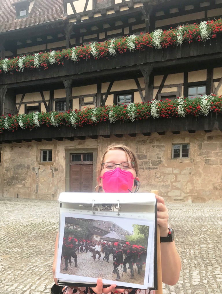 We crossed a river with rapids where kayakers could train for competition, took pictures of painted walls, and entered the church courtyard where the guide show us a picture of a Three Muskateers movie taken here on location as if it were Paris: