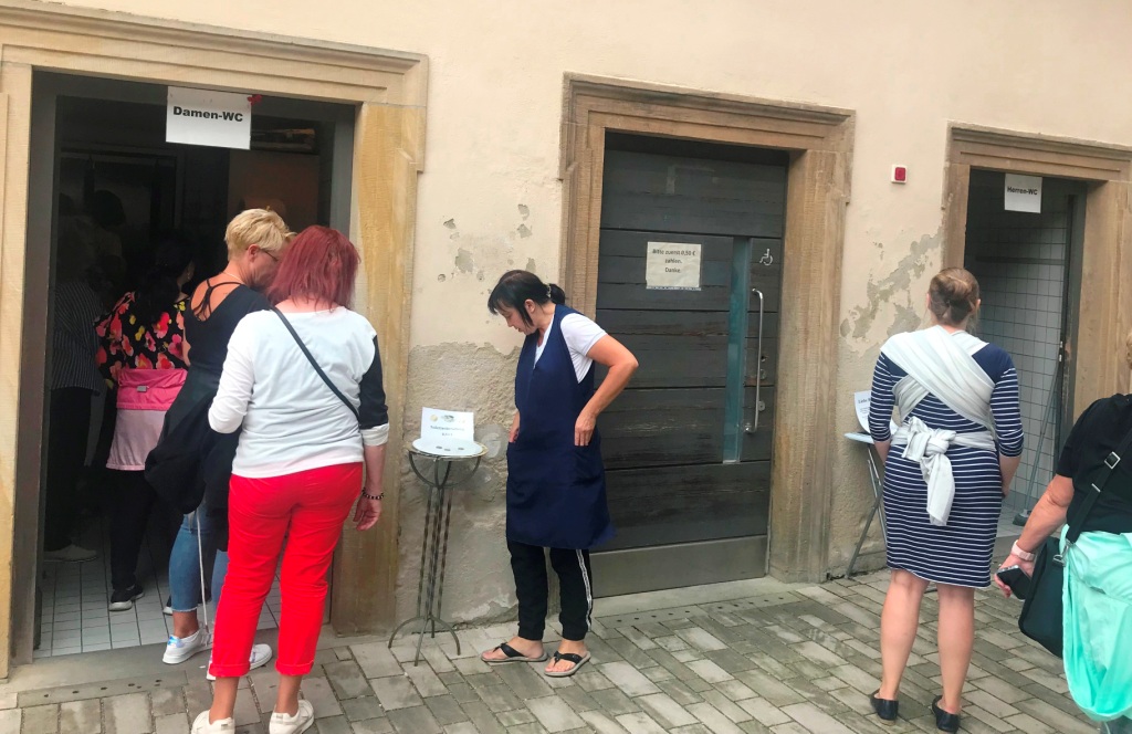 Nearby, I took a picture of a typical waiting line and euro collection plate at a toilette (Damen and Herren)...