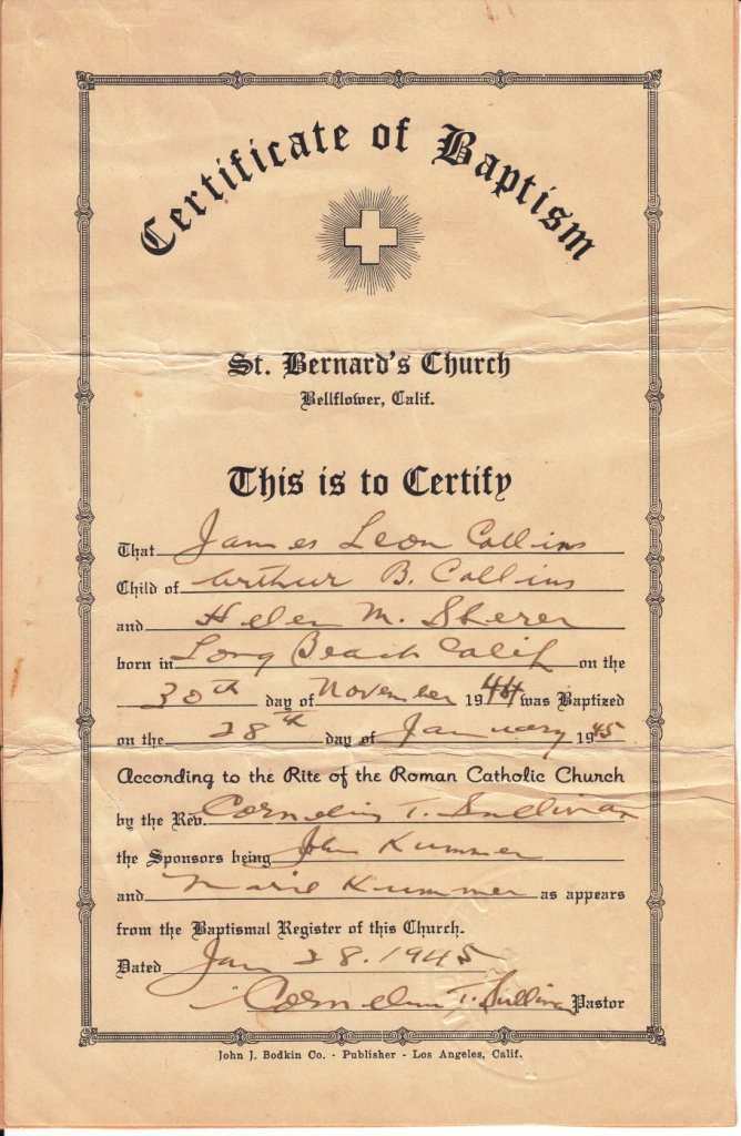 I was born in Long Beach on November 30, 1944, just before the Battle of the Bulge. My mother, Helen, the former “ Dolly” Scherer, had been fighting her own battle of the bulge for nine months and, I am sure, was anxious for relief. My father, Arthur, took some time off work from the airplane factory, to be with my mom and me. I was baptized shortly after at Saint Bernard Church in Bellflower. My Godparents, John and Marie Kummer (my dad's employers when he worked at their dairy), put on a special celebration after the ceremony. I found out many years later that my wife, Barbara, was born (January 28, 1945) on the day I was baptized.