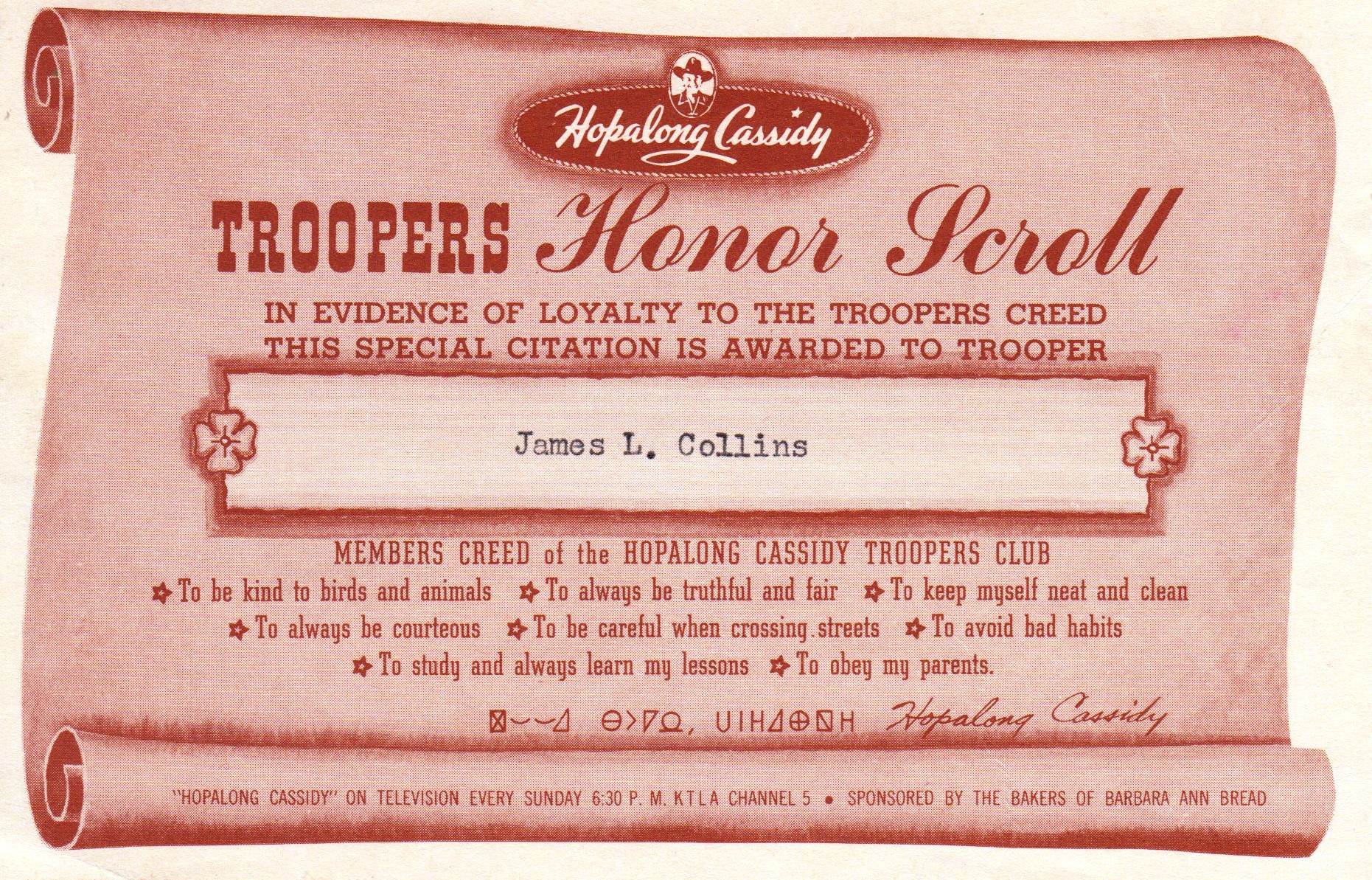 Our home became a magnet for the neighbors when my dad bought the first television on the block. Even the test pattern was a source of amazement on the tiny round screen. We watched all the new TV shows together. It wasn't long before I received the Troopers Honor Scroll in the mail. Now I had two heroes: Grandpa and Hopalong Cassidy.