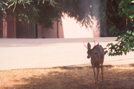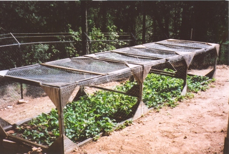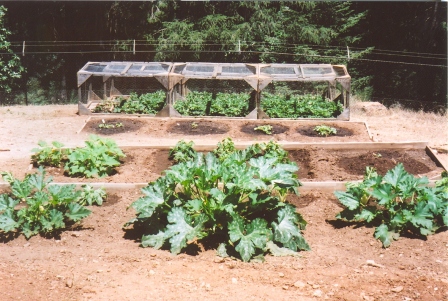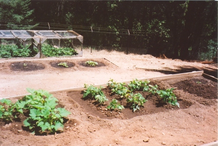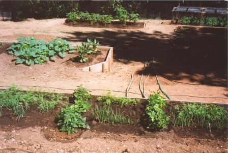 July '07 garden view from the patio, west side; egg plant and crook neck squash flourished. Zucchini produced well in July. Swiss chard struggled entire season.