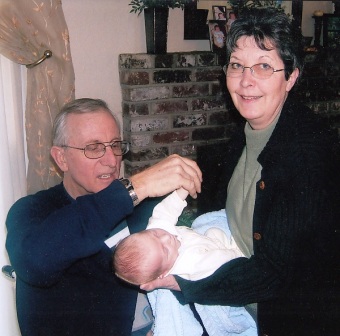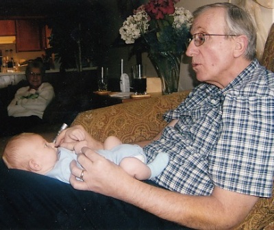 2005 began with my first visit to see Carson. Jeff drove Mom and me through the snow from Reno to Sacramento. I had finally been released from physical therapy for my ski injuries and was anxious to meet our new grandson. I was still in a wheelchair during our first visit. Barbara held Carson while I shook hands using my uninjured right arm. On our second visit, I could use both arms and entertain Carson with the reflection and movements of my cane.