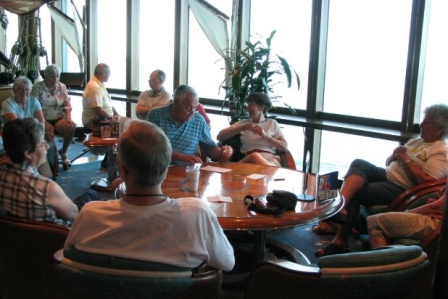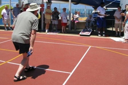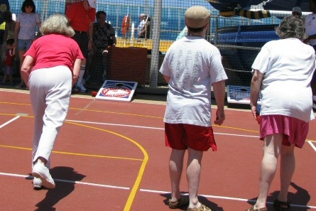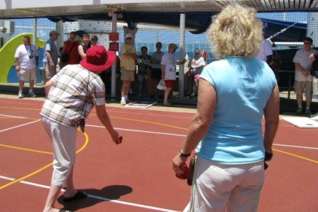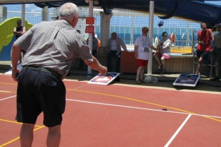 Back on board ship we exercised in the heat. The old folks' cruise features a bean bag throw competition.
