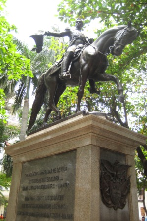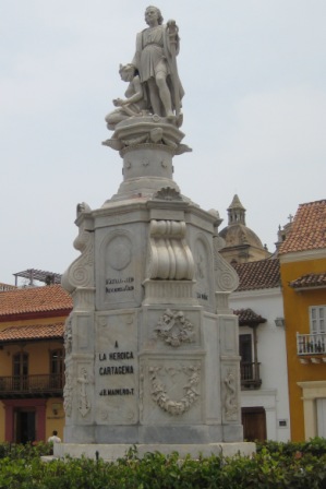 Cartagena's central plaza features monuments to Columbus (upper left) and its liberator, Simon Bolivar (upper right). The statue of St. Peter Claver (center) is at the entrance to the cathedral.