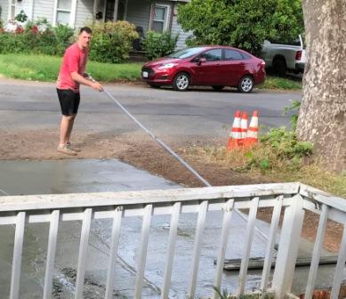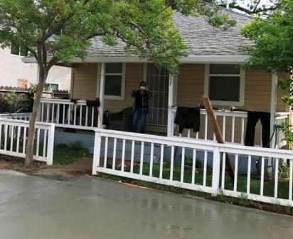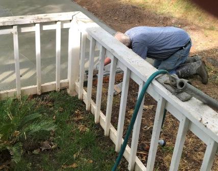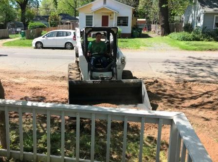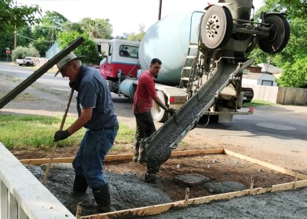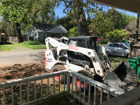 During the continued isolation, Joe's cement project was a welcome break from the routine. Chico did not provide curbs, gutters, sidewalks, or drainage in his neighborhood, so he needed a parking spot in front of his home. The cement pad would eliminate mud, weeds, and low spots and help keep his home free of mud. A week before the cement truck arrived, Joe rented a jack hammer to deal with pavement and rocks. After that, we used a rototiller to break up the soil. Next, Joe moved excess dirt to the back yard with a Bobcat. Then we set up forms and put down rebar to hold the cement.