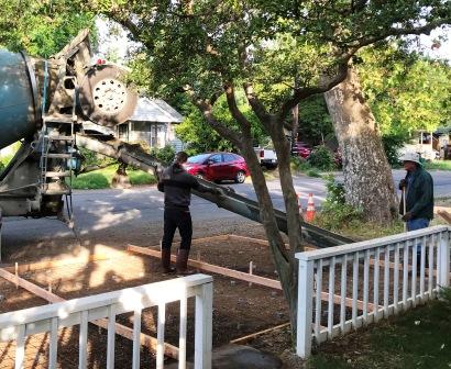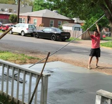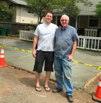 A week later, we were ready to fill the forms. We learned on the go dealing with about five yards of cement. Within a few hours, Joe was smoothing the cement while I worked on the edges. Meanwhile, Barbara took some pictures from the porch. At the end, Joe and I posed in front of our project.