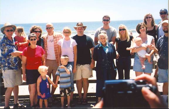 The Collins clan at Grandma Collins’ birthday party, July 2005, at Seacliff beach near Santa Cruz: back row l to r: Jim holding Helena, Shane, Jeff, Jenny, Steve, Joe, Rachel, Ellen, Arnie; front row l to r: Barbara, Mikayla, Wyatt, Helen, Maggie holding Carson, Jason.