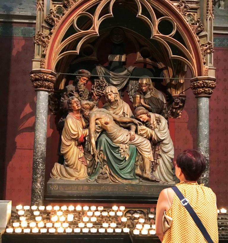 Peter continued to lead the tour around the outside explaining that the lighter stone indicated replacement work. We could see workers continuing the replacement work on scaffolds. A while later, Peter invited us to tour the inside by ourselves quietly: