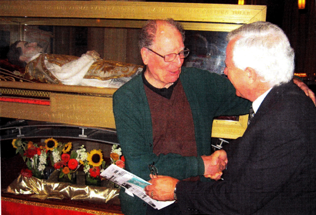 As we entered the church we could see about 100 parishioners near the relics. Fr. “Jack” Giacomini knelt in the front pew nearest Don Bosco. As he approached the relics to end his veneration, I asked him to pose for a picture that I would share with Fr. Occhio in a few weeks. When he moved closer to the relics, he squeezed my hand tightly and reminded me that he, Fr. Occhio, and several others had come to the United States about 70 years ago.