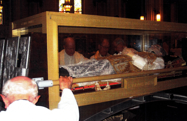 Barbara and I arrived early Sunday morning, September 12, to venerate the relics of St. John Bosco. At 6:00 in the morning bright spotlights lit up the front of St. Peter and Paul Church against the dark, foggy sky.