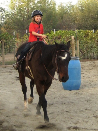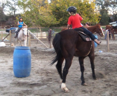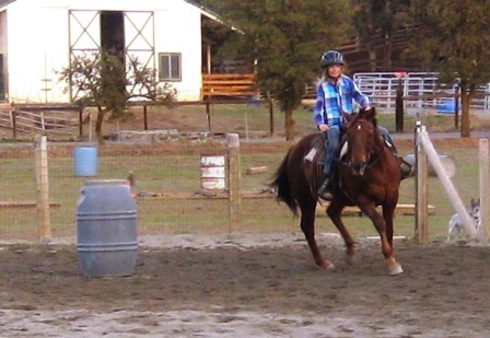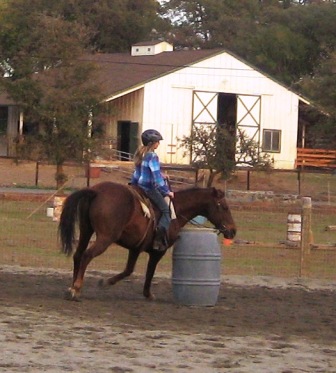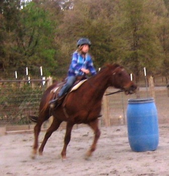 Mikayla rides Gunner faster each time she practices galloping around the barrels: