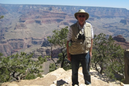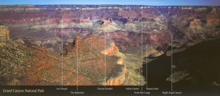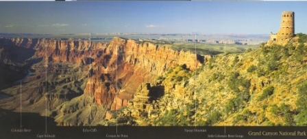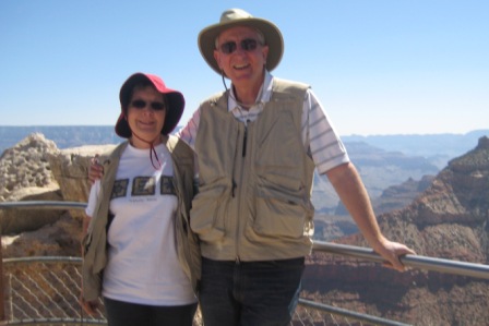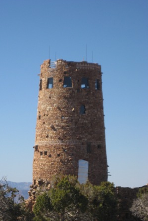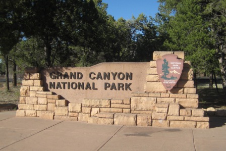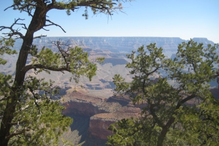 We drove our rental car for about an hour from Williams to the Grand Canyon. The road was straight and the countryside was arid. The trees increased in size as we approached the Grand Canyon but we couldn't see it until we were in the parking lot. The Canyon is so vast (roughly ten miles across and hundreds of miles long) that pictures don't do it justice.