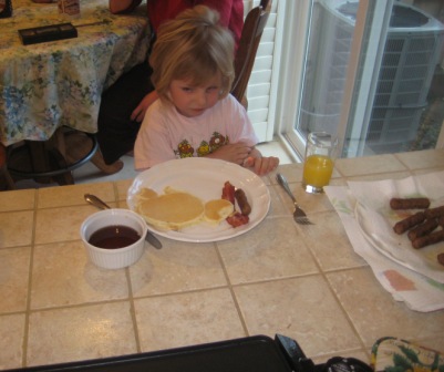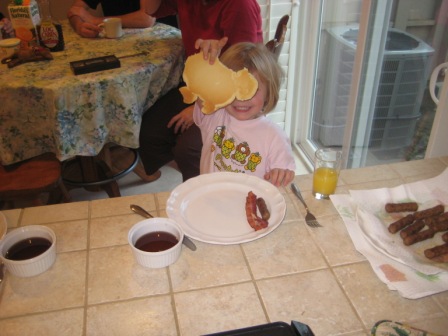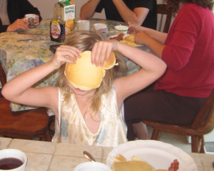 Mikayla showed off her Hawaiian treat for Trixie, the family dog, while Tori looked skeptically at Grandpa’s attempt at a Scooby Doo pancake.