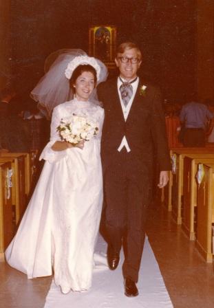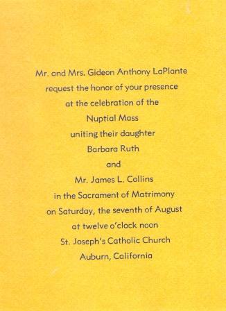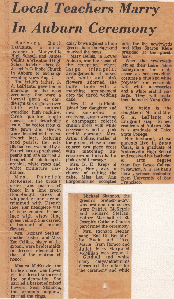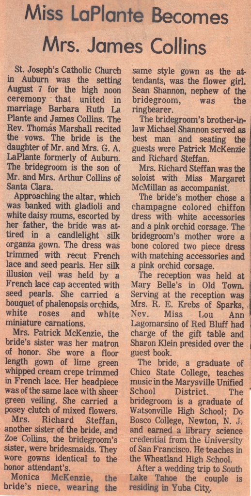 I first met the beautiful Barbara LaPlante in 1971. We were both praying for a Catholic spouse. I used to scout out the eligible young ladies at Sunday mass at St. Isidore's in Yuba City. I saw Barbara at one of the masses, and then recognized her at the apartment where I was living. Barbara was working as a music teacher for the Marysville School District. I was working as a librarian at Wheatland High School by day and as a philosophy teacher by night at Yuba College. We met in March. I proposed in June, and we were married in August. We celebrated our wedding at St. Joseph's Catholic Church in Auburn where Barbara had lived from 1945 to 1968.