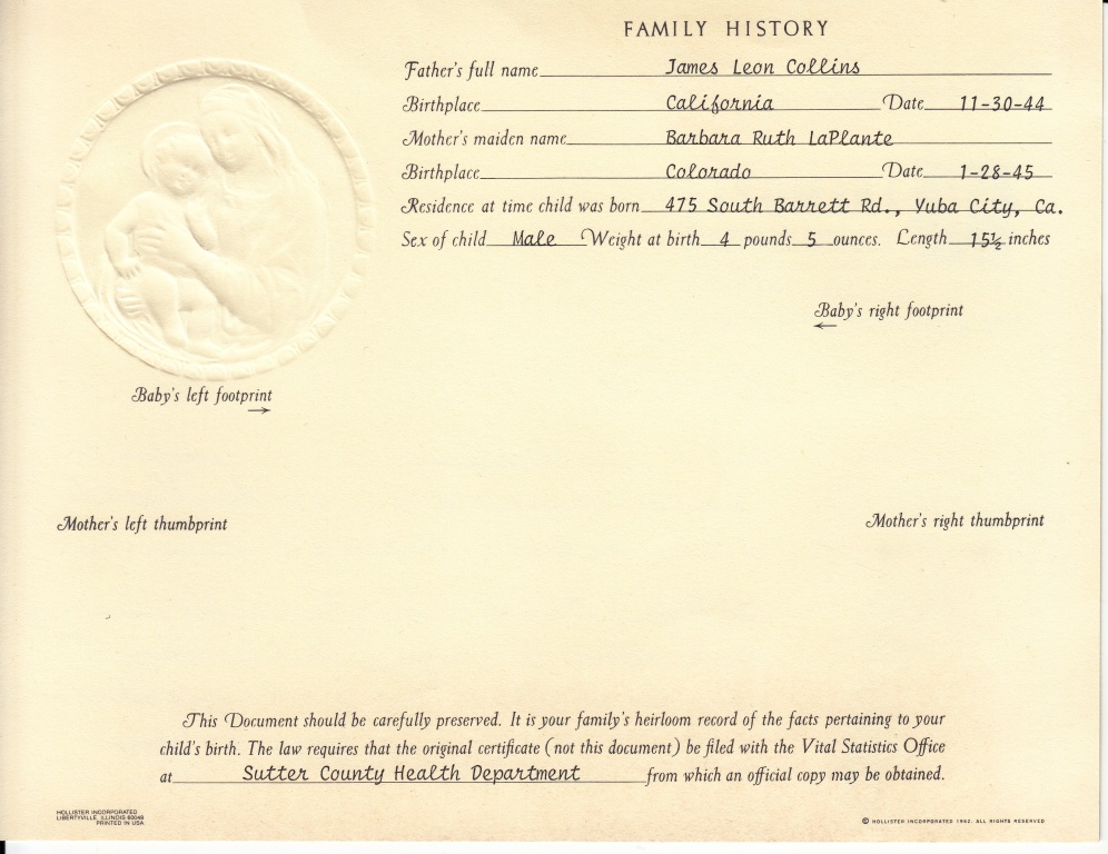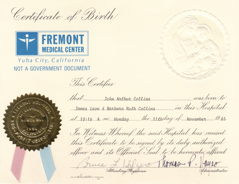 Only a few mementos of John Arthur remain. His birth certificate. Apparently there was no opportunity for footprints. He was tall like our other children but premature and light.