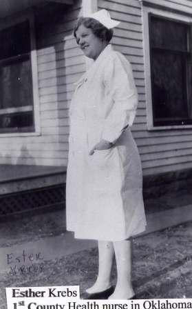 Esther Pauline Krebs was a county health nurse for Tulsa city – county health department. She was the first public health nurse hired by the state health department in 1935 when the state was gripped in a death – dealing spiral meningitis epidemic. She was able to save all but one patient. Another milestone was when Dr. R.M. Adams, founder of Tulsa’s first city health department in 1940, hired her and three other public health nurses to open the new service in Tulsa. In 1950 when the city and county health units were merged, she was named a field supervisor in the combined nursing force.