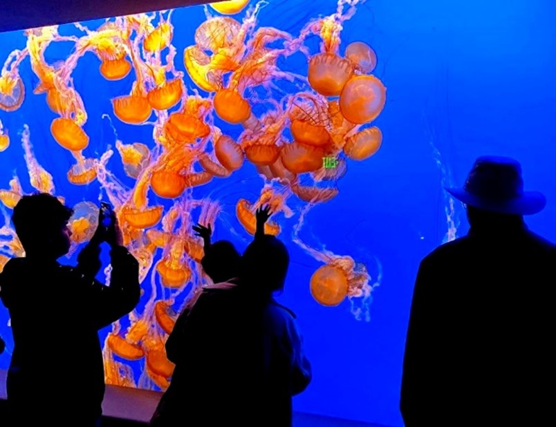 April started with another visit to doctors at Stanford. After receiving positive news about Barbara’s progress, we celebrated with lunch at the nearby mall where Barbara admired the spring flowers. Later on, we stopped by Seacliff beach then the Aquarium in Monterey:
