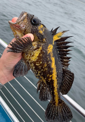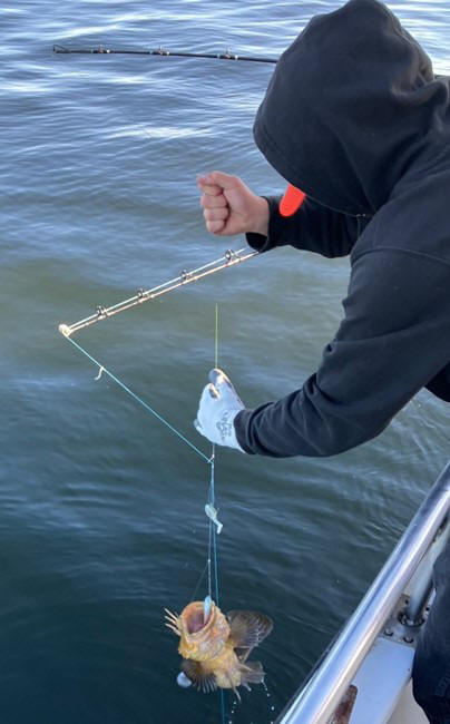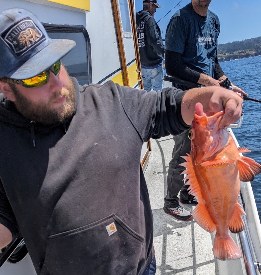Sick or not, a few minutes later Joe was the first of our group to reel in a fish, a Rosie rockfish: