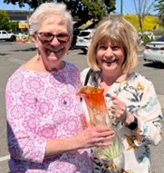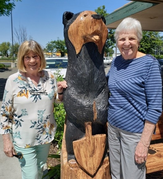 Joan and Joyce with the Black Bear Diner bear; Joan presents Zoe with an heirloom vase from her grandmother Zoe Sheets Collins