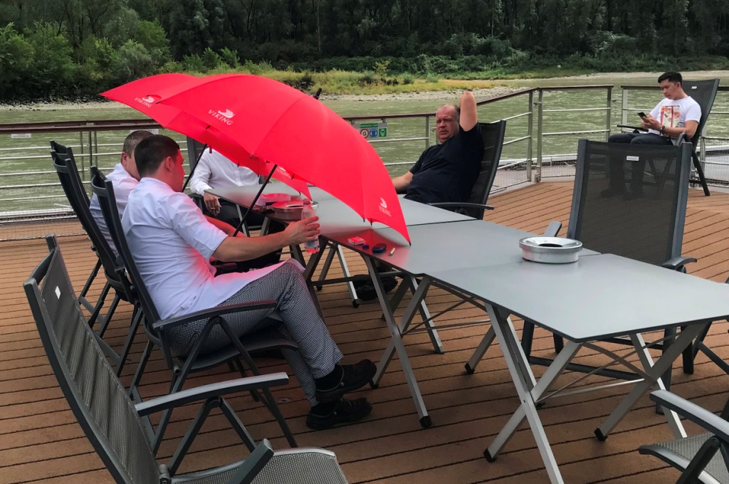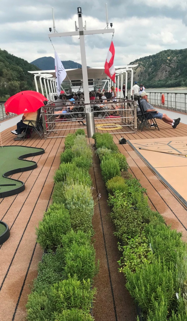 Back on the Viking Baldur we joined euphoric shipmates enjoying our first chance to enjoy the top deck. It was usually closed with the patio covers collapsed to pass under bridges. I tried out the putting green then snapped pictures of everything in sight...