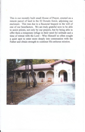 In later August, Barbara and I were invited to spend a few weeks at the Monastery in Georgetown to see if we could meet the requirements to be caretakers and to see if we could take the isolation. Part of our trial involved painting the iron rail rail behind the caretaker's house, opening the chapel in the morning, picking up the mail in the afternoon, driving the nuns to appointments, and taking care of the lawn and garden. Mother Mary Bethany, offered us the caretakers job for one year beginning in October. We rented our Campus Commons condo and began our caretaker job on October 4. We were happy to enter the Monastery gates: