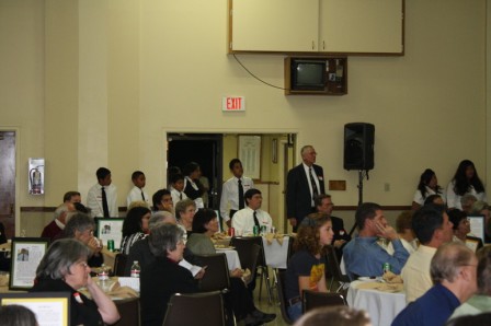 When Thomas took over for the door prize raffle he hardly showed any anxiety that his wife, Leah, was due to give birth at any time (Victoria Evelyn arrived on November 10). His appeal for pledges had our guests reaching for pens and pledge cards. When it was time for the final invocation, both Bishops were gone, called to other duties. I led our guests in prayer to thank the Lord Jesus for a great Banquet.