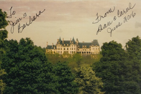 The next morning, Dan & Carol treated us to a quiche and some cinnamon rolls back on the deck. We treasure the Biltmore: Our Table to Yours Cookbook that they gave us as a parting gift. The enclosed postcard is a great memento of their hospitality: