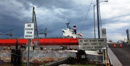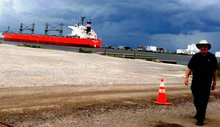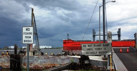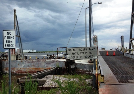 Further down the road at a dilapidated store selling pizza by the slice we met one of the locals who introduced himself as a real Cajun and welcomed us to Cajun country as he marveled at our California license plate. To reach Cameron we waited in line to take a free ferry boat across the channel. While we waited, I took pictures of a container ship headed up the channel towards Lake Charles.
