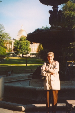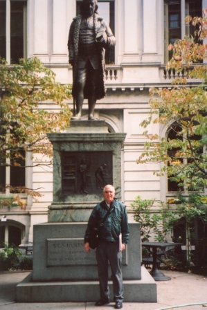 Barbara at Boston Commons fountain with State House in background. Jim at Benjamin Franklin Statue just past King's Chapel at Old City Hall. The statue rests on the site of the first public school in America, a good place for retired teachers to visit.