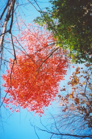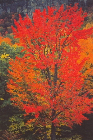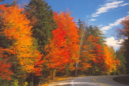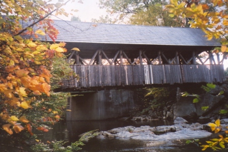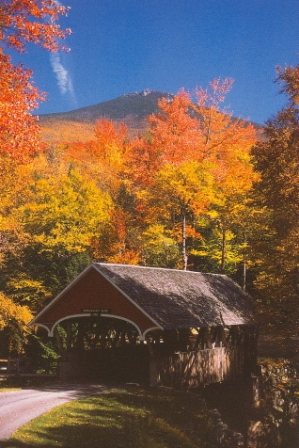 From there we drove towards Bethel in western Maine passing through the Sebago Lake area where the leaves were close to peak colors. As the sun went down we arrived in Bethel. The leaves had been beautiful but not at the peak colors that I remembered from my college days in New Jersey. After attending Saturday evening Mass at Our Lady of the Snows we prayed for good weather and better leaf color on Sunday. We were the first ones to breakfast on Sunday morning and asked Fred, our host and cook, where to find the best leaves. I told him how I remembered places in New England where the trees formed arches over the road in brilliant fall colors. Immediately, he suggested a short drive to a nearby covered bridge, then a drive down highway 113 through the White Mountain National Forest to be followed by a trip on the Kancamagus Highway in New Hampshire. See pictures below: