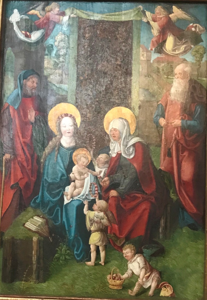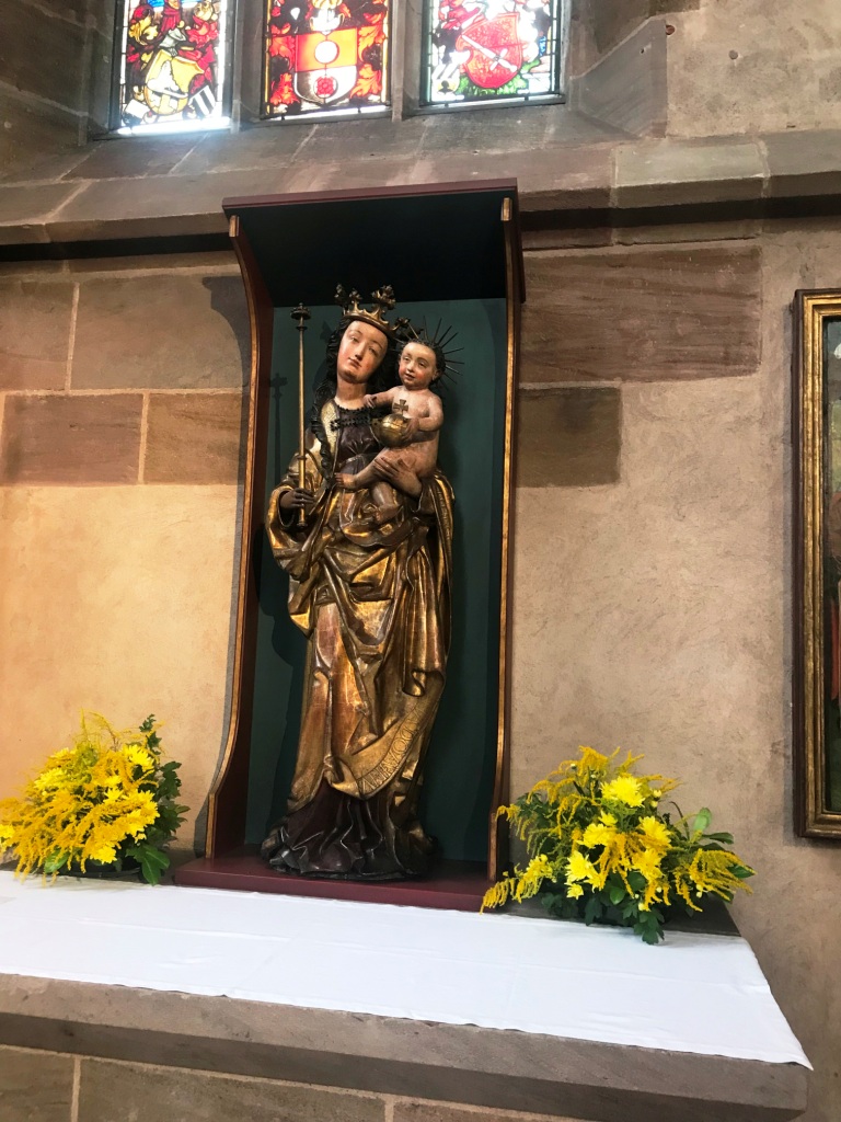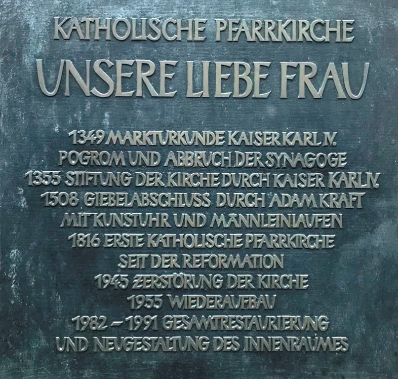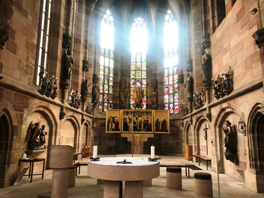 Barbara and I broke away from the group in search of a Catholic Church for mass. Using our map in the fog, we headed in the wrong direction until we spoke with a taxi driver who set us on the correct course, Then Barbara reminded me how well Google maps would direct our way on a walking tour to the Frauenkirche, the Church of Our Lady. As we did in Cologne, we chanced upon a protestant (Lutheran) church first. I asked someone in the church, "Catholic?" They responded, "It used to be, but the Lutherans took it over" By the time we arrived, the mass had finished, so we read the readings for the Sunday, prayed, and took pictures inside the church.