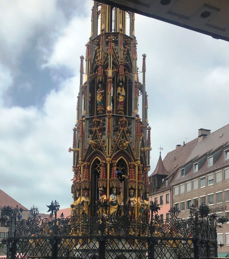 On the nearby plaza, we found a souvenir shop where we discovered some marionette Christmas tree decorations and a few refrigerator magnets. As we exited the shop, we ran into our original tour group, took a few pictures, then searched for the famous Nuremberg gingerbread. Every bakery and supermarket was closed for Sunday, so we were denied gingerbread: