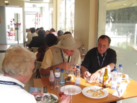While we were in the lunch line, I spoke some poor Italian to a man just behind me in line. He seemed to be disappointed in the buffet’s selections. So I asked him what he saw, Che cosa qui? And where’s the pasta, Dove la pastachuta? He said, “I don’t know” (No so). He settled for the fish. Later I asked him what he was doing here. He was taking video for Vatican television. We exchanged an arrivederci’s as our group left.
