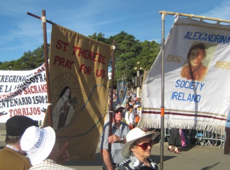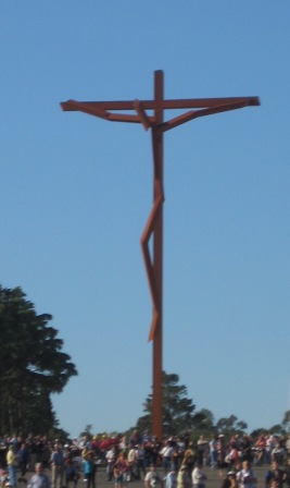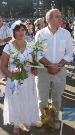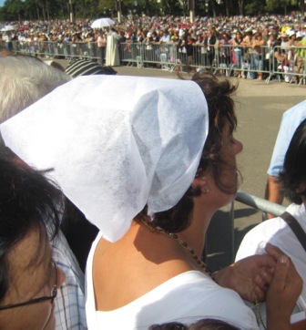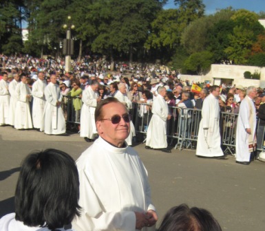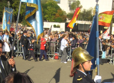 We woke up around 8:00 and had just enough time for a quick Continental breakfast before the 9:00 rosary. We found a good spot for our seats near the central parade route. In some ways the daytime procession was more impressive than the night before. The sky was a piercing blue color with a few wisps of cirrus clouds. The colorful banners and uniformed police and scouts were sharp in the morning sun.