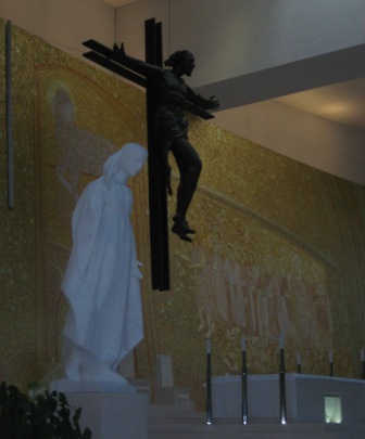 At 4:30 we met in the lobby then walked to the Basilica. Mass was in progress so we walked to the Our Lady of Sorrows Chapel then across the square (after taking pictures of the holm oak where Mary appeared) then to the new Church of the Most Holy Trinity half underground and aboveground with beautiful mosaics and an enormous crucifix.
