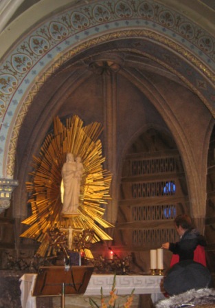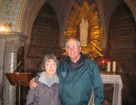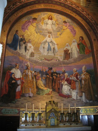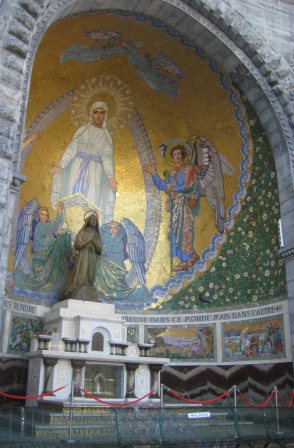 Francois, our guide, showed us the exquisite mosaics outside the Basilica (see above) and the side altars inside with more mosaics. Many of the French saints had mosaics like Jennifer’s patron saint, St. Genevieve. We were especially amazed at the mosaic of the coronation of Mary donated by the people of the United States which offered an overview of those involved in the apparitions.